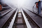 高速動(dòng)車(chē)組列車(chē)在高速行駛中帶起的雪花結(jié)成了冰,附著在列車(chē)地盤(pán)上,這些冰層會(huì)影響機(jī)械師對(duì)列車(chē)地盤(pán)的檢查,對(duì)行車(chē)安全帶來(lái)隱患。因此在檢修前,機(jī)械師們先要把列車(chē)地盤(pán)和輪軸上的冰清除干凈。這些冰大多聚集在地盤(pán)零件的空隙里,凍的非常結(jié)實(shí),要想把它們處理干凈,傳統(tǒng)的方法是用特制的工具,一點(diǎn)點(diǎn)往下鏟。為此,北京德高潔清潔設(shè)備有限公司組織技術(shù)力量,研發(fā)了一款全自動(dòng)高速動(dòng)車(chē)組列車(chē)底盤(pán)、輪軸除冰系統(tǒng)。